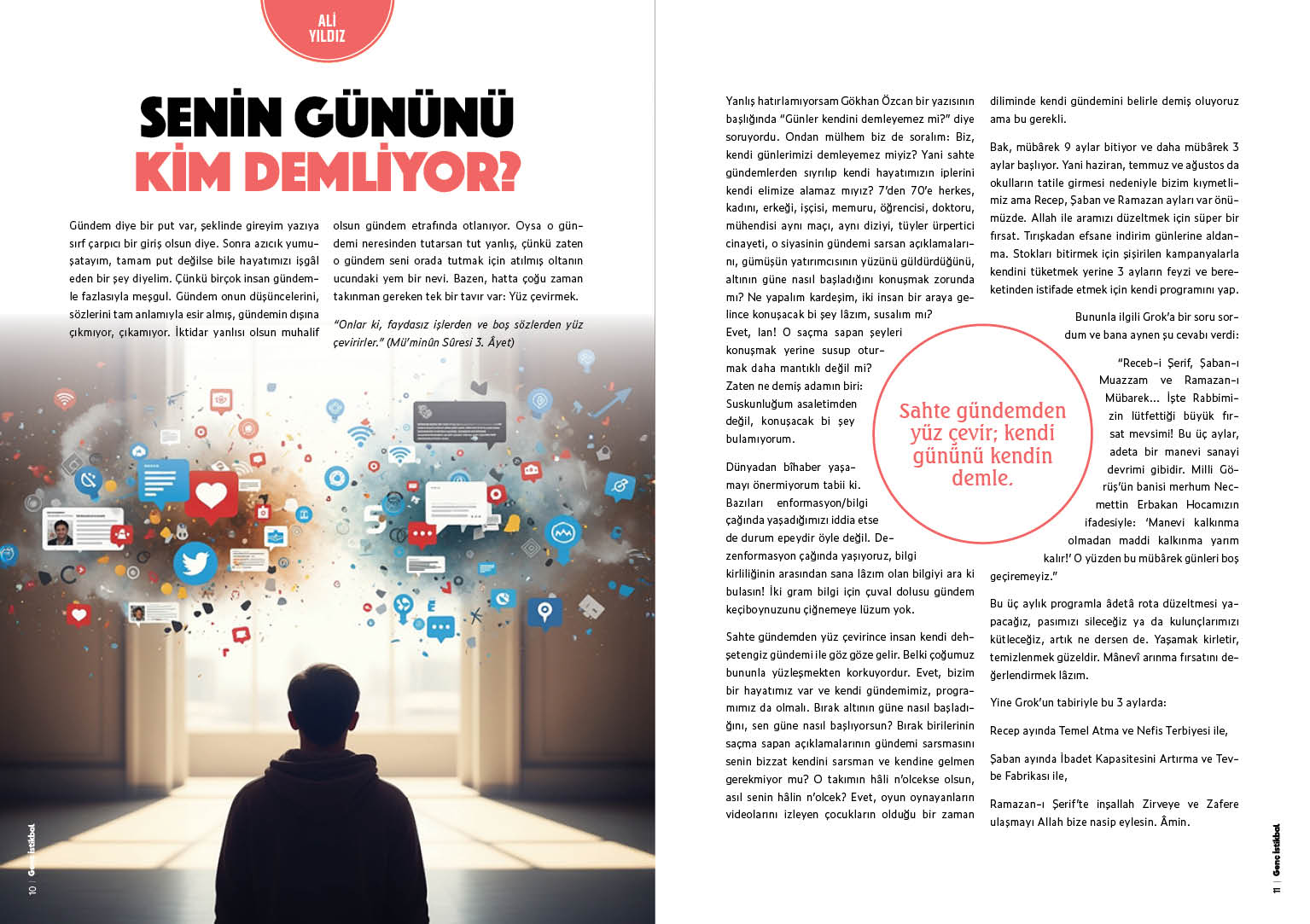 Gündem diye bir put var, şeklinde gireyim yazıya sırf çarpıcı bir giriş olsun diye. Sonra azıcık yumuşatayım, tamam put değilse bile hayatımızı işgâl eden bir şey diyelim. Çünkü birçok insan gündemle fazlasıyla meşgul. Gündem onun düşüncelerini, sözlerini tam anlamıyla esir almış, gündemin dışına çıkmıyor, çıkamıyor. Üstelik kendini muhalif diye konumlandıran kişiler bile gündem etrafında otlanıyor. Oysa o gündemi neresinden tutarsan tut yanlış, çünkü zaten o gündem seni orada tutmak için atılmış oltanın ucundaki yem bir nevi. Bazen, hatta çoğu zaman takınman gereken tek bir tavır var: Yüz çevirmek. "Onlar ki, faydasız işlerden ve boş sözlerden yüz çevirirler." (Mü'minûn Sûresi 3. Âyet) Yanlış hatırlamıyorsam Gökhan Özcan bir yazısının başlığında "Günler kendini demleyemez mi?" diye soruyordu. Ondan mülhem biz de soralım: Biz, kendi günlerimizi demleyemez miyiz? Yani sahte gündemlerden sıyrılıp kendi hayatımızın iplerini kendi elimize alamaz mıyız? 7'den 70'e herkes, kadını, erkeği, işçisi, memuru, öğrencisi, doktoru, mühendisi aynı maçı, aynı diziyi, tüyler ürpertici cinayeti, o siyasinin gündemi sarsan açıklamalarını, gümüşün yatırımcısının yüzünü güldürdüğünü, altının güne nasıl başladığını konuşmak zorunda mı? Ne yapalım kardeşim, iki insan bir araya gelince konuşacak bi şey lâzım, susalım mı? Evet, lan! O saçma sapan şeyleri konuşmak yerine susup oturmak daha mantıklı değil mi? Zaten ne demiş adamın biri: Suskunluğum asaletimden değil, konuşacak bi şey bulamıyorum. Dünyadan bîhaber yaşamayı önermiyorum tabii ki. Bazıları enformasyon/bilgi çağında yaşadığımızı iddia etse de durum epeydir öyle değil. Dezenformasyon çağında yaşıyoruz, bilgi kirliliğinin arasından sana lâzım olan bilgiyi ara ki bulasın! İki gram bilgi için çuval dolusu gündem keçiboynuzunu çiğnemeye lüzum yok. Sahte gündemden yüz çevirince insan kendi dehşetengiz gündemi ile göz göze gelir. Belki çoğumuz bununla yüzleşmekten korkuyordur. Evet, bizim bir hayatımız var ve kendi gündemimiz, programımız da olmalı. Bırak altının güne nasıl başladığını, sen güne nasıl başlıyorsun? Bırak birilerinin saçma sapan açıklamalarının gündemi sarsmasını senin bizzat kendini sarsman ve kendine gelmen gerekmiyor mu? O takımın hâli n'olcekse olsun, asıl senin hâlin n'olcek? Evet, oyun oynayanların videolarını izleyen çocukların olduğu bir zaman diliminde kendi gündemini belirle demiş oluyoruz ama bu gerekli. Bak, mübârek 9 aylar bitiyor ve daha mübârek 3 aylar başlıyor. Yani haziran, temmuz ve ağustos da okulların tatile girmesi nedeniyle bizim kıymetlimiz ama Recep, Şaban ve Ramazan ayları var önümüzde. Allah ile aramızı düzeltmek için süper bir fırsat. Tırışkadan efsane indirim günlerine aldanma. Stokları bitirmek için şişirilen kampanyalarla kendini tüketmek yerine 3 ayların feyzi ve bereketinden istifade etmek için kendi programını yap. Bununla ilgili Grok'a bir soru sordum ve bana aynen şu cevabı verdi: Bu üç aylık programla âdetâ rota düzeltmesi yapacağız, pasımızı sileceğiz ya da kulunçlarımızı kütleceğiz, artık ne dersen de. Yaşamak kirletir, temizlenmek güzeldir. Mânevî arınma fırsatını değerlendirmek lâzım. Yine Grok'un tabiriyle bu 3 aylarda: |